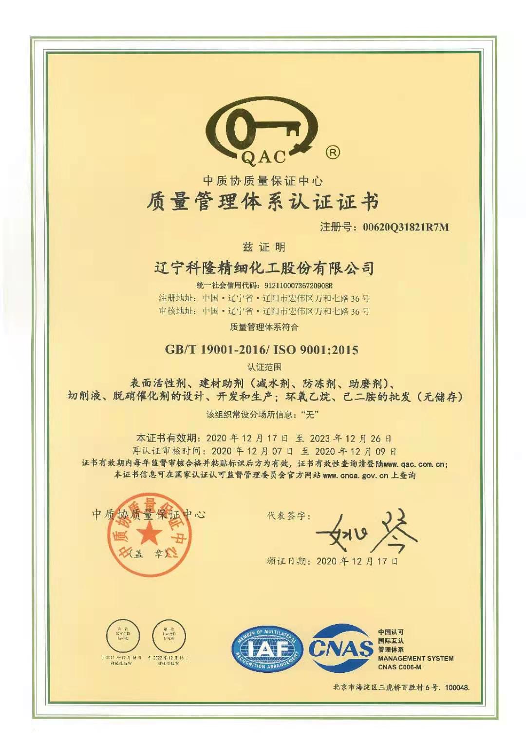 質量管理體系認證證書